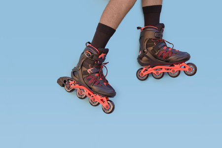 Two legs of boy with inline skates on blue background with copyspace