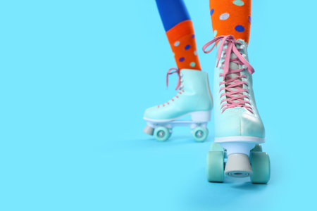 Legs of woman in roller skates on blue background