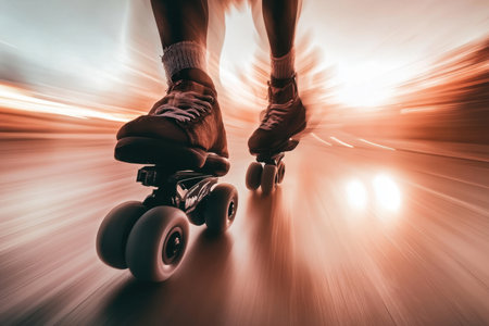 An image showcases inline skates on an asphalt surface, the focus on the skates with a blurred background suggesting movement. Bright sunlight casts a warm glow, enhancing the composition. The style is modern, potentially suitable for promotional or editorial purposes related to sports or lifestyle.