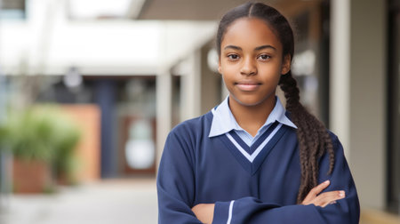 Stylish Teen Girl Rocking School Uniform with Urban Landscape. Generative AI