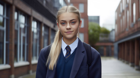 Happy Teenage Student Posing in Uniform with School Building in Background. Generative AI