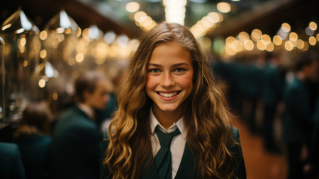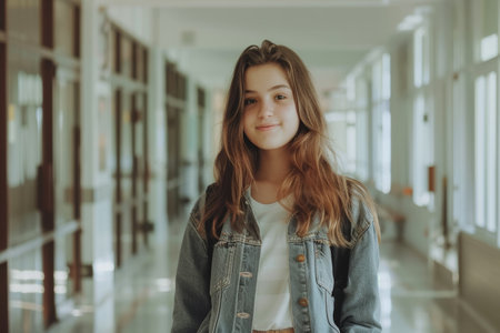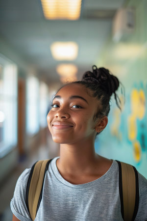 A confident teenage girl standing in a brightly lit school hallway, smiling warmly, representing youth and optimism.