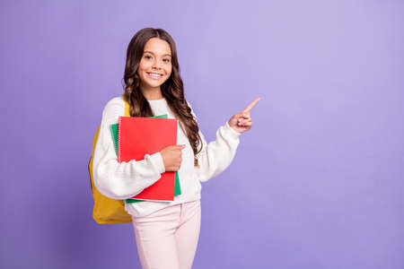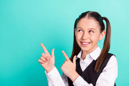Photo of young school girl happy positive smile indicate fingers empty space ad advise promo isolated over green color background