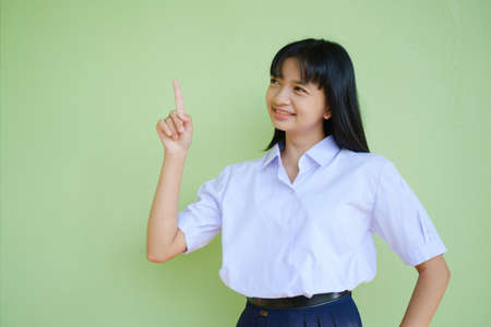 Happy pretty Asian student girl in school uniform pointing finger up isolated on white background.