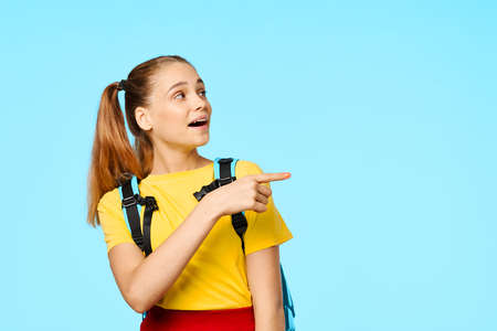 schoolgirl with a backpack and in a yellow t-shirt shows her finger to the side on a blue background