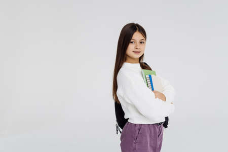 Portrait of teenager girl with school backpack holding colored folders isolated on white background