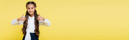 Happy preteen pupil showing thumbs up isolated on yellow, banner