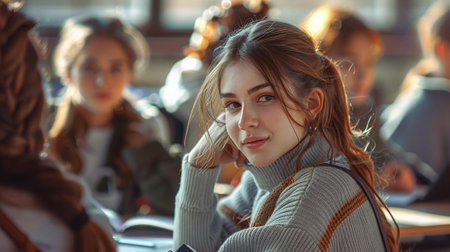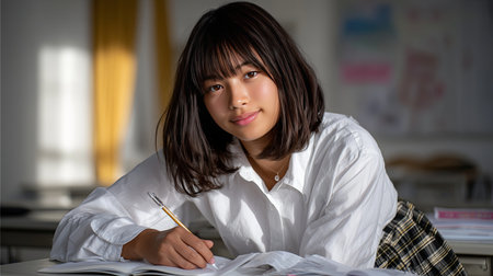 A young student sits at a desk in a classroom, focused on her studies while writing with a pencil. Sunlight streams through the window, illuminating her concentration.