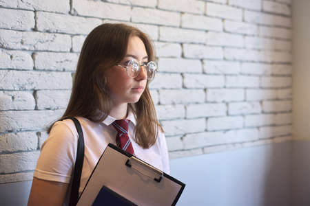 nice smile. Young business kid holding folder. Beautiful brunette girl with folder of documents in her hands. teen kid holds folder in hands. office life. get knowledge from archive