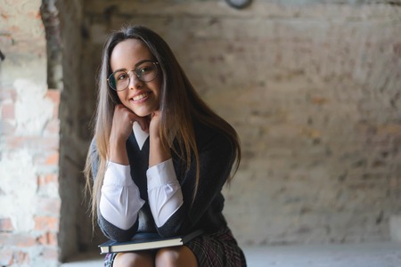 Pretty girl in uniform sitting on the stairs and leaning on elbows on the loft background