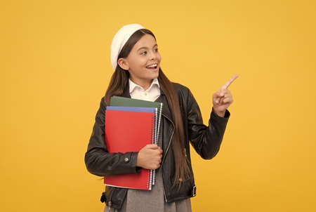Look. Happy school child point finger yellow background. Pointing gesture. Pointing for advertising