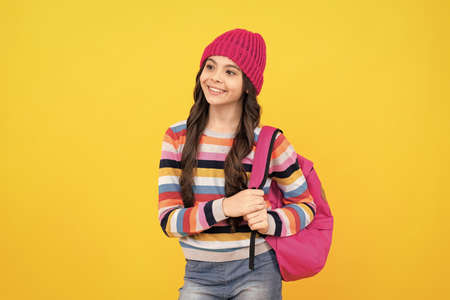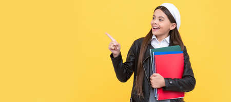 Look. Happy school child point finger yellow background. Portrait of schoolgirl student, studio banner header. School child face, copyspace.