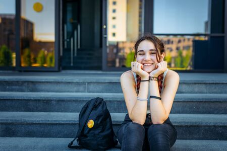 Beautiful College student girl sitting on the steps and laughing looking at camera. Portrait of a cheerful high school girl with two long braids.