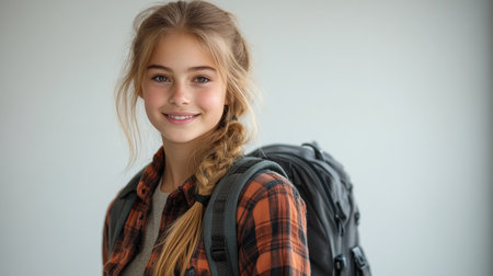 A smiling girl in checkered attire stands ready for her next journey with a backpack.