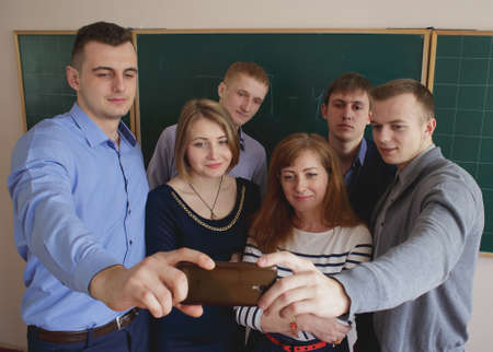 LUTSK, UKRAINE - 22 April 2017: Group of students and teacher taking selfie at classroom. Shallow depth of field.
