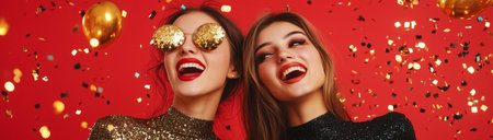 Smiling women in evening clothes on a red background close up, created with Generative AI technology