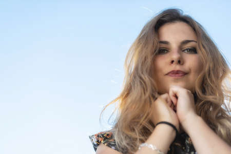 Portrait of atractive long haired young woman posing outdoors against blue sky. Bottom view.