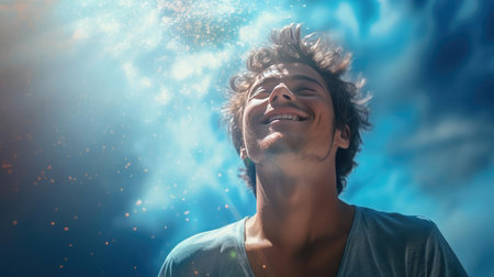 A young man is smiling and looking up at the sun. Concept of happiness and positivity
