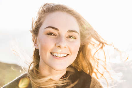 A beautiful young woman smiling brightly bathed in the warm glow of a summer sunset