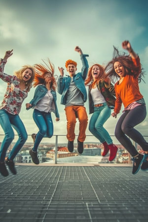 Life is better with friends Full length of young people in casual wear smiling and gesturing while jumping on the pier : Generative AI