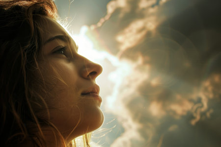 A woman with long hair is looking up at the sky. The sky is cloudy and the sun is shining through the clouds. The woman's face is illuminated by the sun, and she is smiling