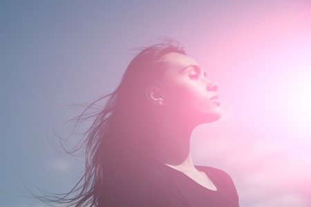 Beautiful young woman with closed eyes breathing relaxing enjoying sun at sunset. Beauty sunshine girl portrait.