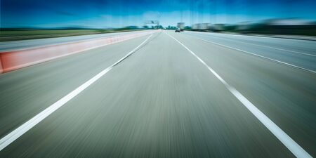 Captivating view of a highway stretching into a cloudy sky, showcasing dynamic motion effects and striking yellow road markings offering an engaging travel perspective.