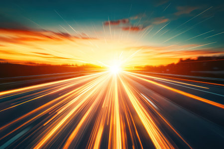 Streaks of orange and white light accelerate towards a brilliant vanishing point, symbolizing the rapid pace of technological advancement and the forward momentum of innovation. This dynamic visual represents a journey into the future, powered by data, speed, and limitless potential.