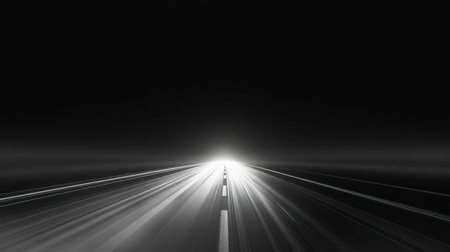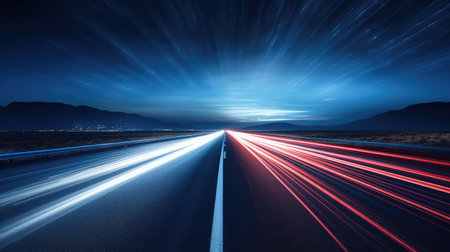 Captivating view of an empty highway at night, showcasing dynamic motion blurs and vibrant colors in the sky, evoking a sense of speed and adventure.