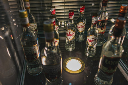Bucharest, Romania - March 26, 2016: Several types of bottled alcohol are displayed on some shelves in a pub in Bucharest, Romania.