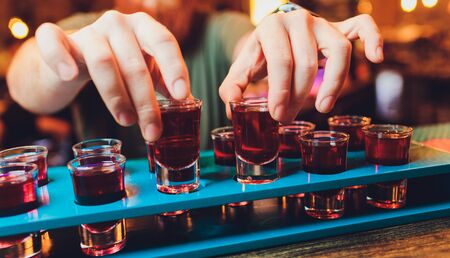 Red alcoholic shot drinks in glasses in a row on the bar count. Restaurant menu.