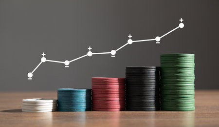 Poker chips colorful gaming pieces lie on the game table in the stack. Background for gambling, casino, business, poker. Colorful casino chips for casino game on the table. soft focus