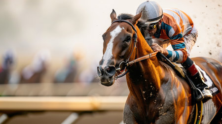Dynamic image captures intense motion of horse racing event. Racehorse galloping at full speed with jockey urging horse onward. Blurred background
