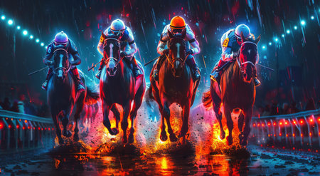 Jockeys racing horse at high speed with a futuristic blue and red motion blur background.