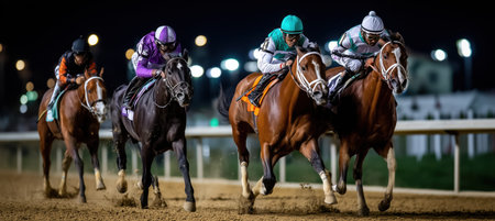 A jockey clad in racing silks urges a thoroughbred racehorse down a floodlit racetrack, kicking up sand at twilight.
