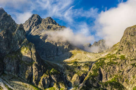 Beautiful views on trail from Roztoka Valley to Valley of Five Polish Ponds in Polish High Tatras. Mountains in clouds. Carpathians, Poland