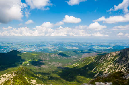 zakopane summer landscape. beautiful view from gubalowka in to the distant tatra mountains. popular travel destination of poland. sunny weather with puffy clouds above the magnificent ridge