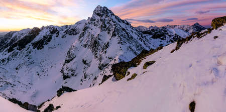 The breathtaking view of the mountains peaks covered in snow under at sunset in High Tatras Slovakia