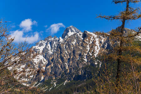 Landscape in the Polish Tatra Mountains. View of the snow-capped peaks in April.