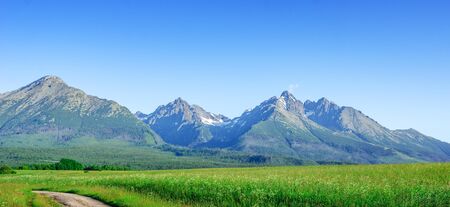 amazing nature, summer in the mountains. Travel and hike. Tatra Mountains in summer time. beautiful panorama of agricultural area. gorgeous mountain ridge with high rocky peaks