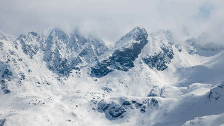 Mountain panorama in the Tatra mountains in Slovakia. A view of a magnificent ridge (Ridge Hrubego, Hrube, Hrubo) in the snow on a sunny day.