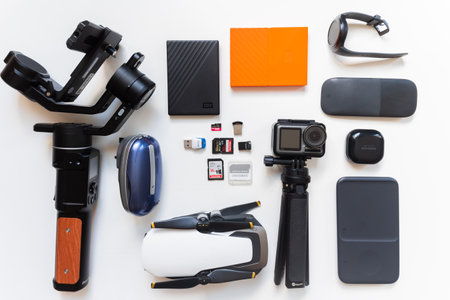 USA- 2021: Flatlay top view beginner photographer extra gear accessories set up background.Content creator, photographer, traveller and blogger extra gear carry on. Cut out outdated gear