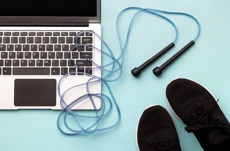 Flat lay top view of laptop with sport equipments on blue background.