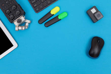Top View of Photographers, Videographers or Video Bloggers Workplace. Digital Gadgets Lying on Blue Table - Flat Lay