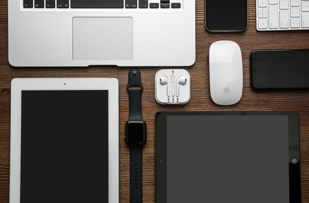 Apple watch, Ipad, iphone, airpods pro on the wooden table, May 2021, San Francisco, USA