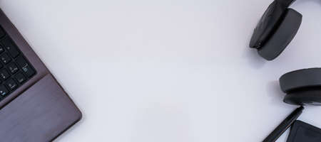 A high angle shot of a laptop with headphones and a pen on a white surface with a copy space