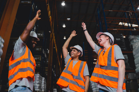 A Group of Diversity warehouse workers giving hand for high-five after success the project and celebrating together in a distribution center warehouse.