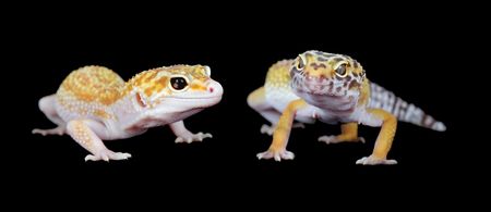 Two cute leopard gecko (Eublepharis Macularius) on a white background.