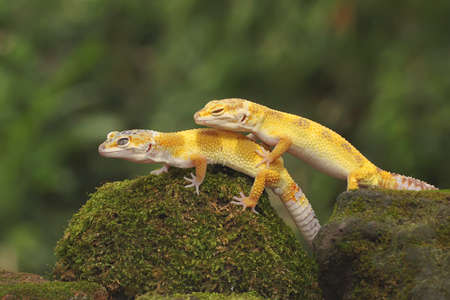 A pair of leopard geckos are getting ready to mate. Reptiles with attractive colors have the scientific name Eublepharis macularius.