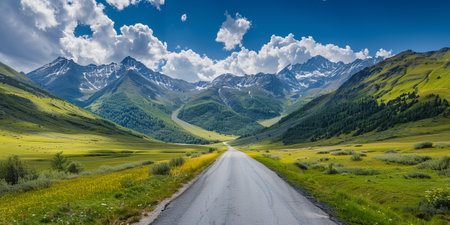 Breathtaking Scenic Road Journey Through Lush Green Valleys Leading to Majestic Mountain Peaks